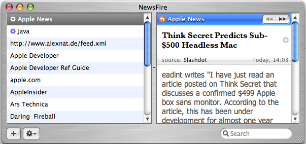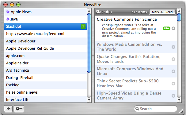 NewsFireRSS bietet ein sehr übersichtliches Interface und kann alle gängigen RSS Varianten lesen. Sobald neue Informationen verfügbar sind, meldet sich das Programm über ein dezent springendes Dockicon und signalisiert dabei auch die Anzahl der neuen bzw. aktualisierten Artikel.