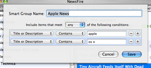 Die eingebaute Suchfunktion ist sehr gelungen: Hier kann analog zu iTunes nach einem Artikel im Archiv gesucht werden. Alternativ durchsucht NewsFireRSS auch vollautomatisch Blogs und andere Nachrichtendienste im Internet.